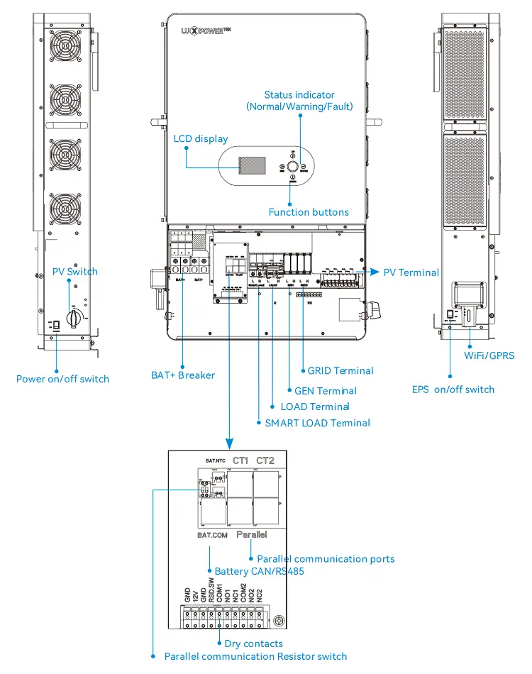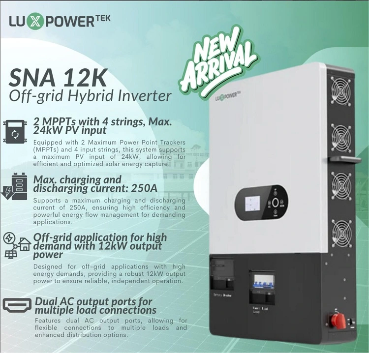 Luxpower Último avance en soluciones de potencia fuera de la red, el modelo LuxPower SNA-EU 12000 de Sunlink, ofrece una potencia de salida robusta de 12kw. Diseñado para la confiabilidad y la versatilidad, proporciona una gestión de energía perfecta en varias aplicaciones.