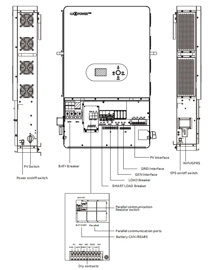 Diseñado para la resiliencia, el Luxpower SNA-US 12000 presenta puertos de salida de doble CA para conectividad de carga múltiple y una robusta capacidad de paso continuo de 100 A. Su puerto generador dedicado y su transición sin interrupciones en la red/fuera de la red aseguran la fuente de alimentación ininterrumpida en condiciones exigentes.